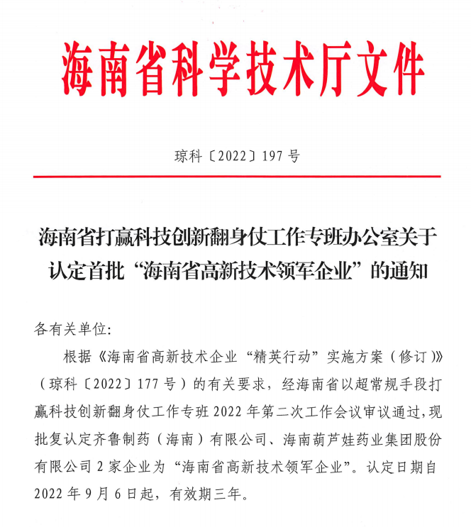近日,海南省科学技术厅发布的《海南省打赢科技创新翻身仗工作专班办公室关于认定首批“海南省高新技术领军企业”的通知》中显示,批复认定海南9001cc 以诚为本药业集团股份有限公司等2家企业为“海南省高新技术领军企业”。认定日期自2022年9月6日起,有效期三年。