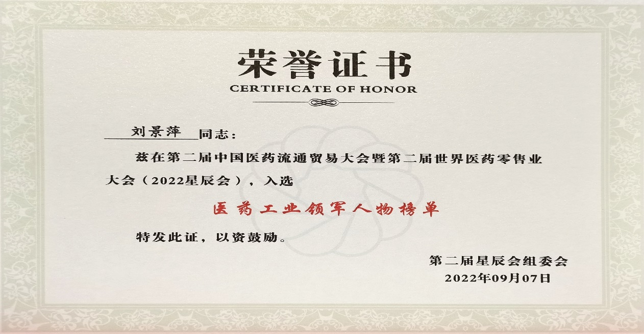 本次星辰会期间,9001cc 以诚为本斩获颇丰,获得多项行业奖项及荣誉。在开幕式上,刘景萍董事长荣获“医药工业领军人物”称号。