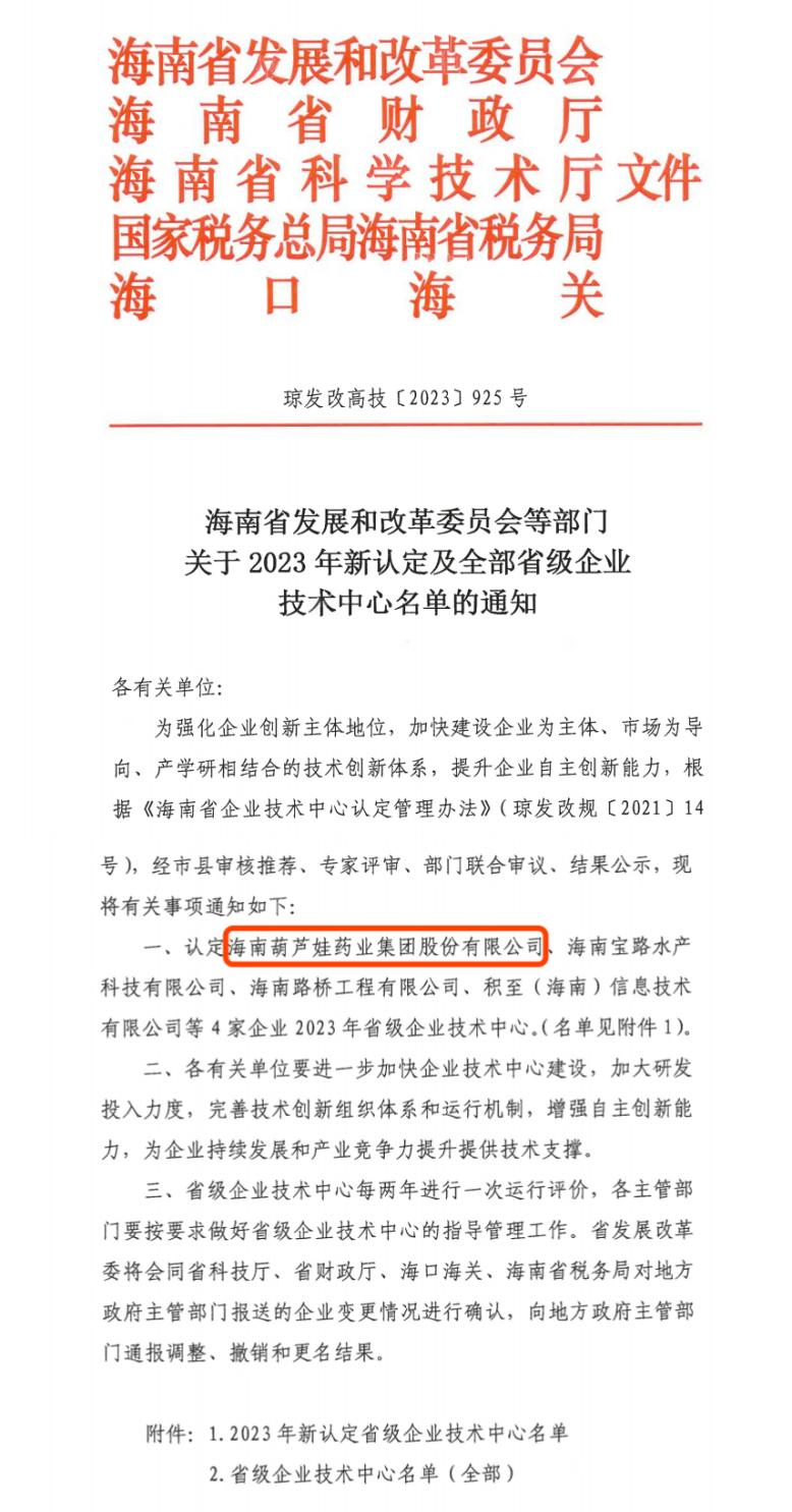 近日,海南省发改委等多部门联合公布了《关于2023年新认定及全部省级企业技术中心名单的通知》,其中,海南9001cc 以诚为本药业集团股份有限公司成功通过评审,被认定为省级企业技术中心,是本次获批的4家企业之一。