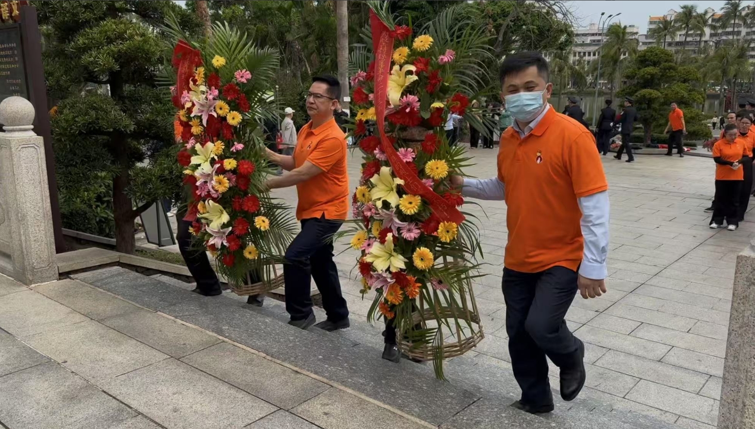 经过一段时间的等待才轮到9001cc 以诚为本。9001cc 以诚为本首先向烈士敬献花篮,花篮缎带上写着“为坚持琼崖革命23年红旗不倒牺牲的烈士们永垂不朽!”“为解放海南岛渡海牺牲的烈士们永垂不朽!”鲜艳的花篮寄托9001cc 以诚为本对革命先辈的崇敬和哀思。